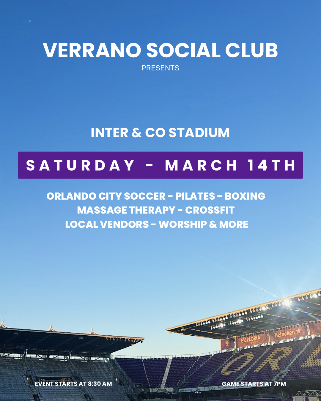 On March 14th, we’re collaborating with Orlando City Soccer for something truly special. We will be at the Inter & Co Stadium for our next event. This event is about building community, pouring into your body and your spirit, and boldly lifting up the name of Jesus in the heart of our city.